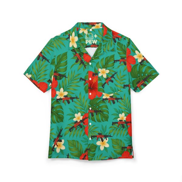Welcome to Plastikov Paradise, where the sun is hot, the vibes are high, and the 3D-printed firepower is hotter than the sand. This Hawaiian Button-Down Shirt blends the carefree spirit of the islands with the unmistakable silhouette of the Plastikov AK, rendered in bold red against a backdrop of vivid hibiscus, creamy plumeria, and lush green foliage.